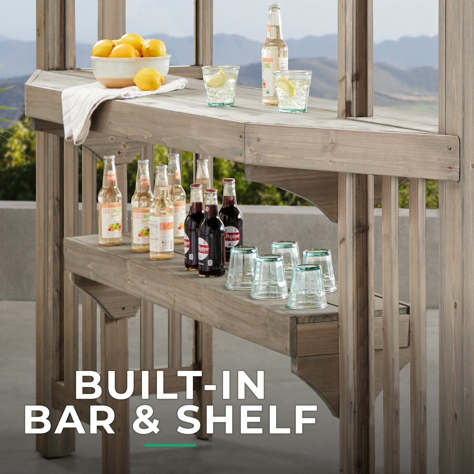 The Yardistry Structures 10×14 Madison Pergola is designed to extend outdoor living spaces. It features 100% natural cedar lumber with a timber gray stain. Includes a bar and counter feature. Equipped with a sunshade. In